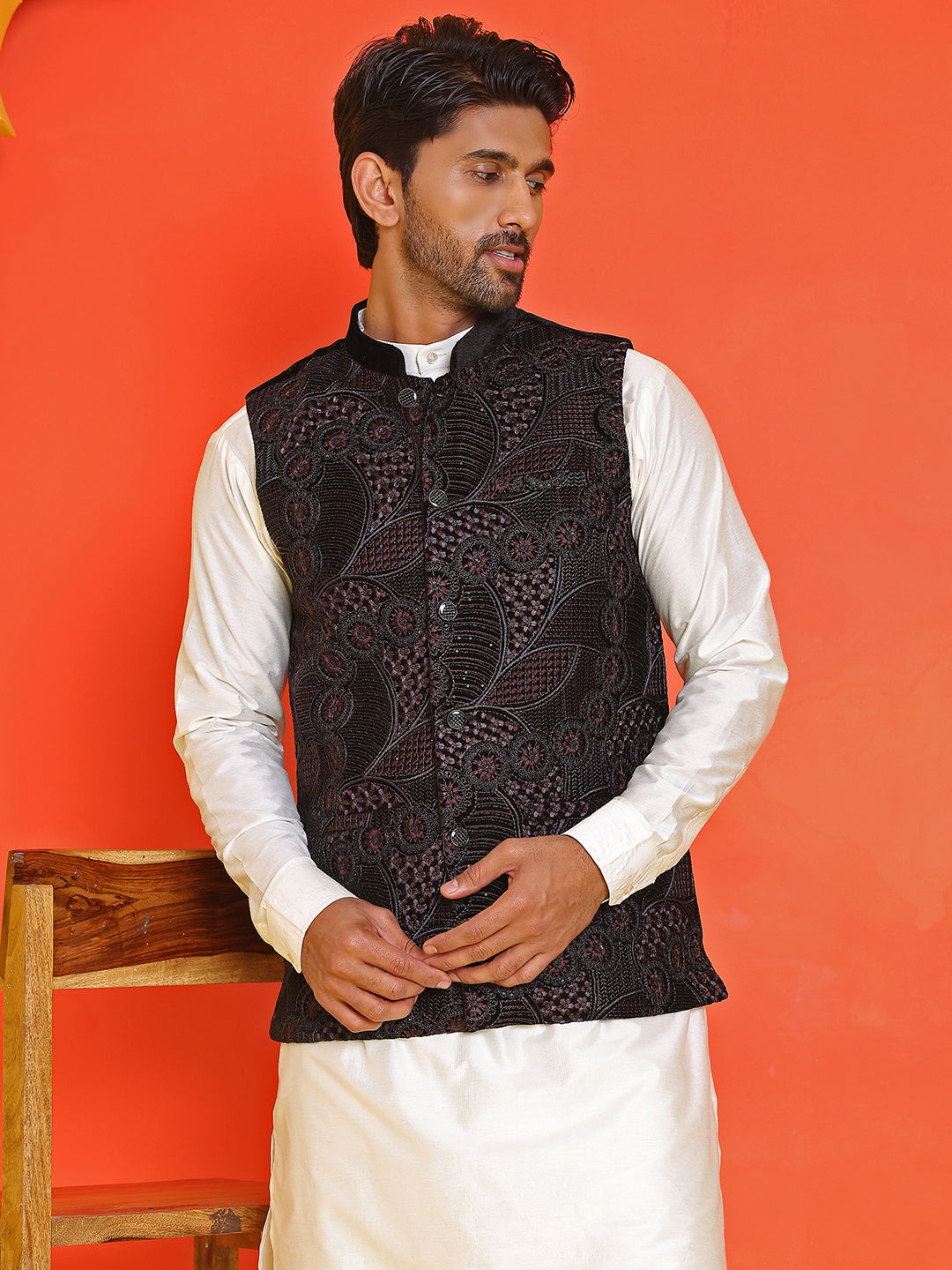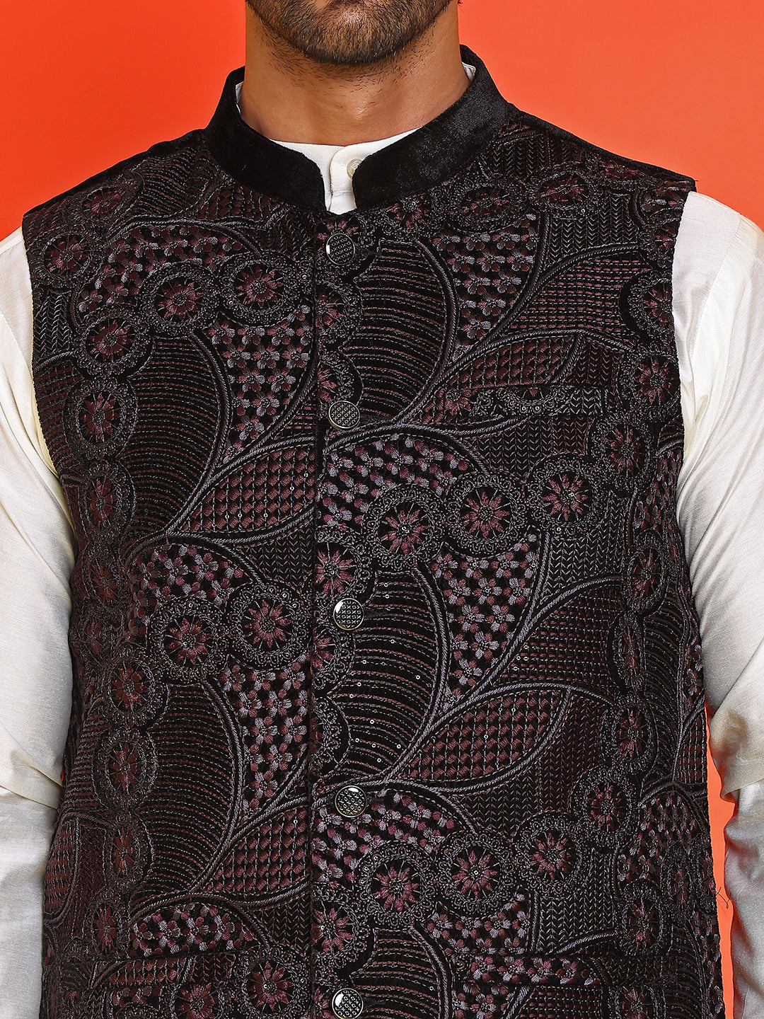 Black Embroidered Velvet Nehru Jacket for Men ( JOWC 4123 Black )