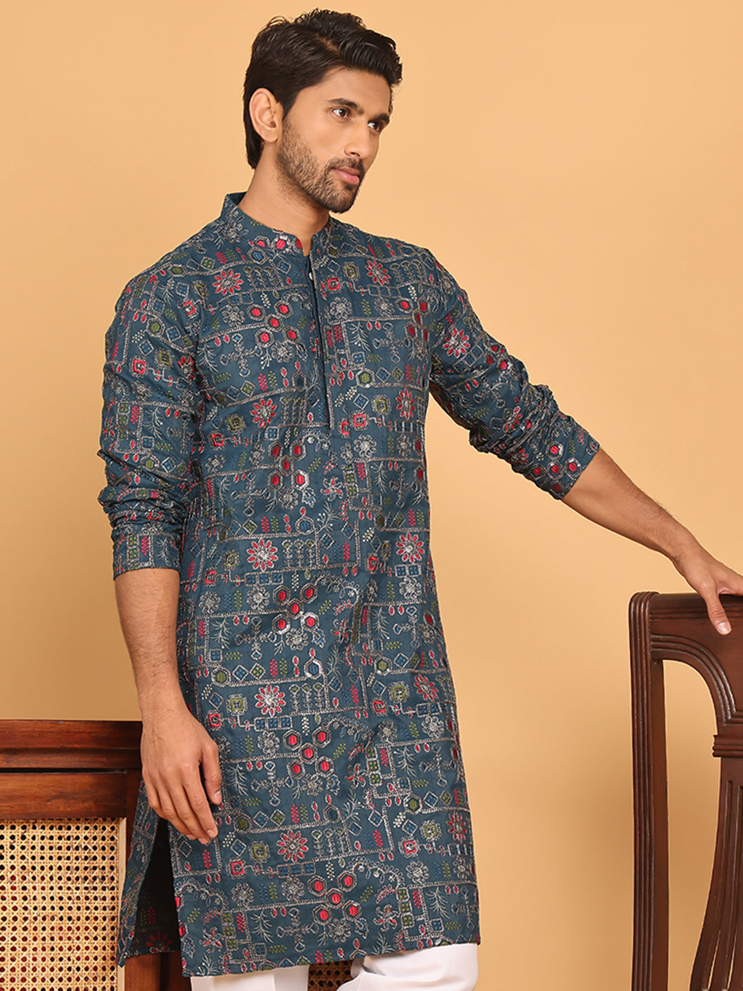 Blue Embroidered Straight Kurtas For Men ( KO 5192 Teal )