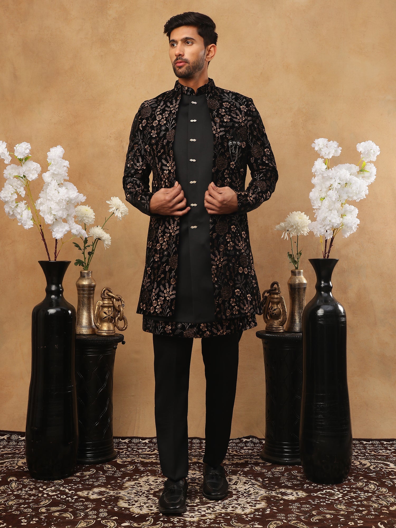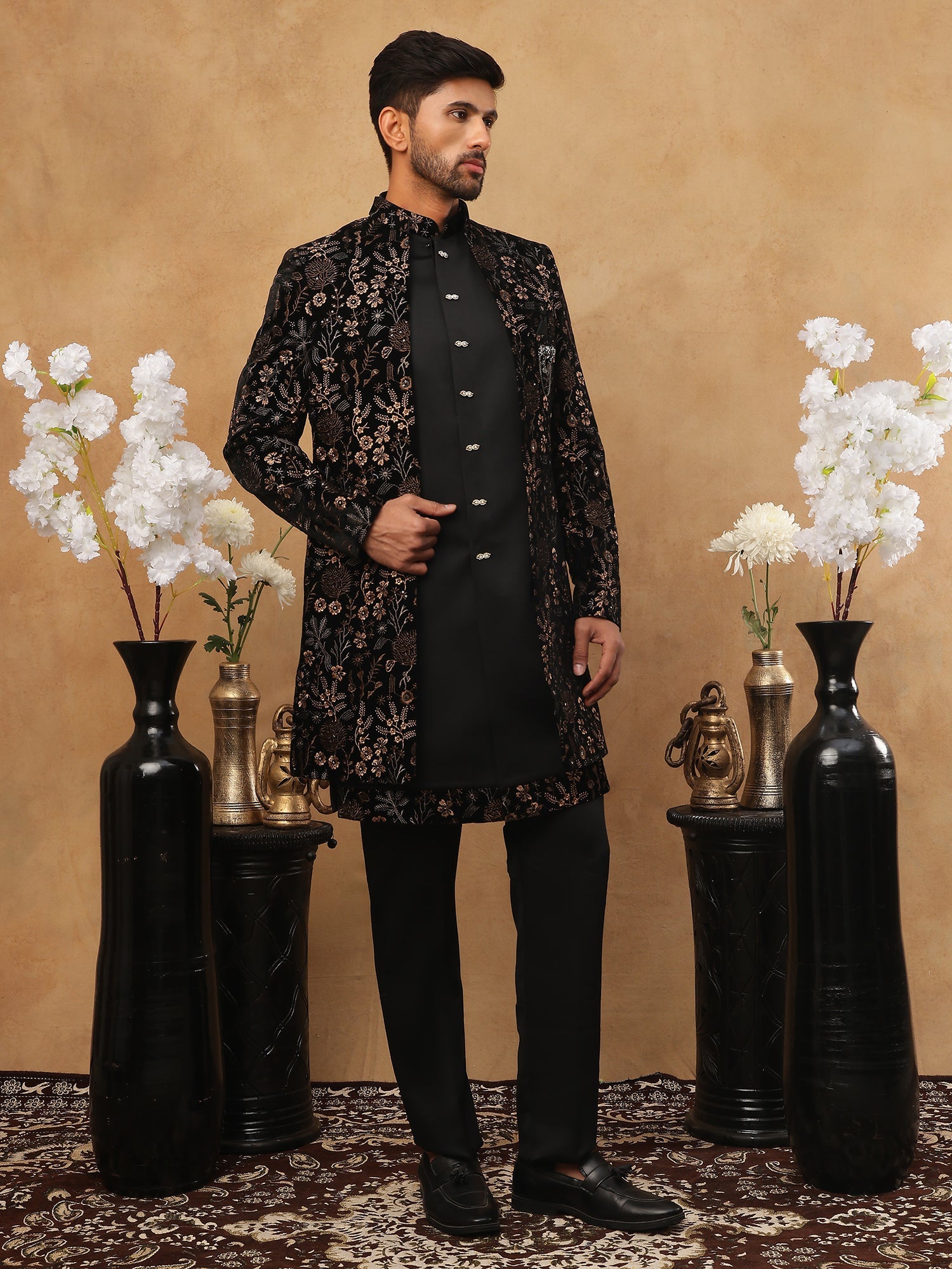 Make a grand entrance with this Black Velvet Indo-Western Sherwani. This piece is a perfect blend of modern tailoring and vintage charm. The jacket is crafted from a luxurious Cotton-Silk Velvet, providing warmth and comfort for evening or winter weddings. The highlight of this outfit is the stunning bronze floral embroidery, which offers a rich, antique metallic look that contrasts beautifully with the deep black velvet. Finished with decorative buttons and a sharp mandarin collar, this set is ideal for grooms, reception parties, or high-profile festive events.