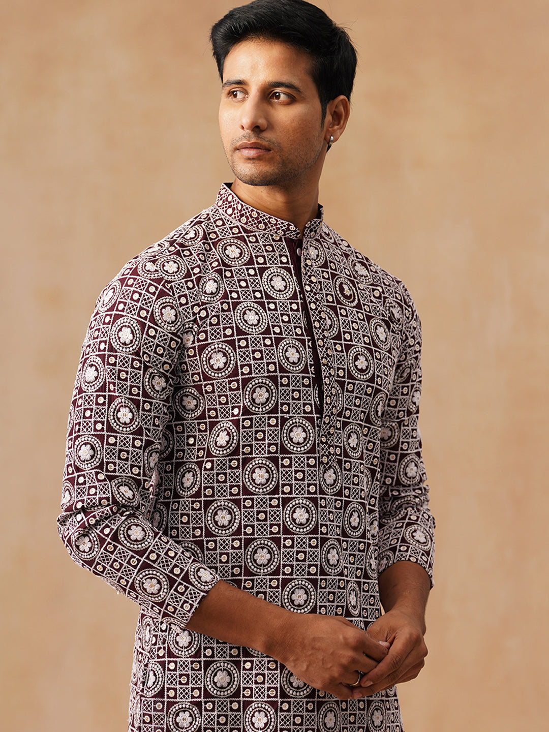 Classic Geometric Embroidered Kurtas ( KO 5279 Wine )