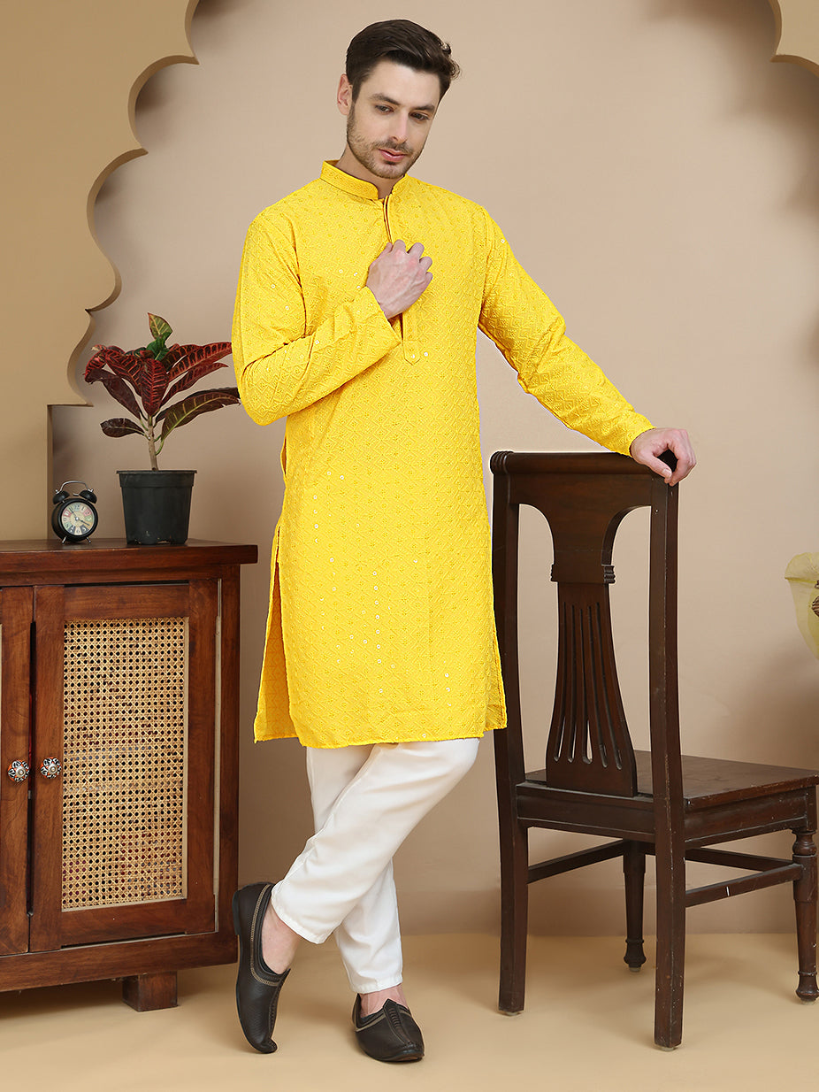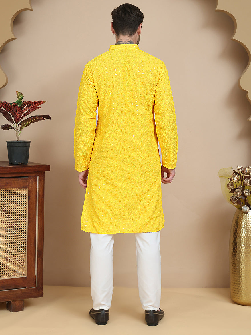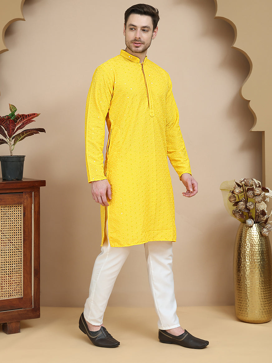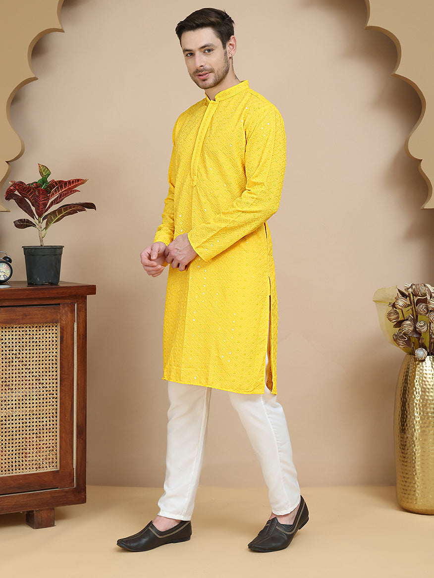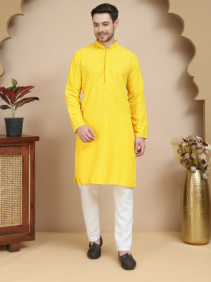 Embroidered Cotton Kurta With Pyjama for Men ( JOKP P 5244 Yellow )