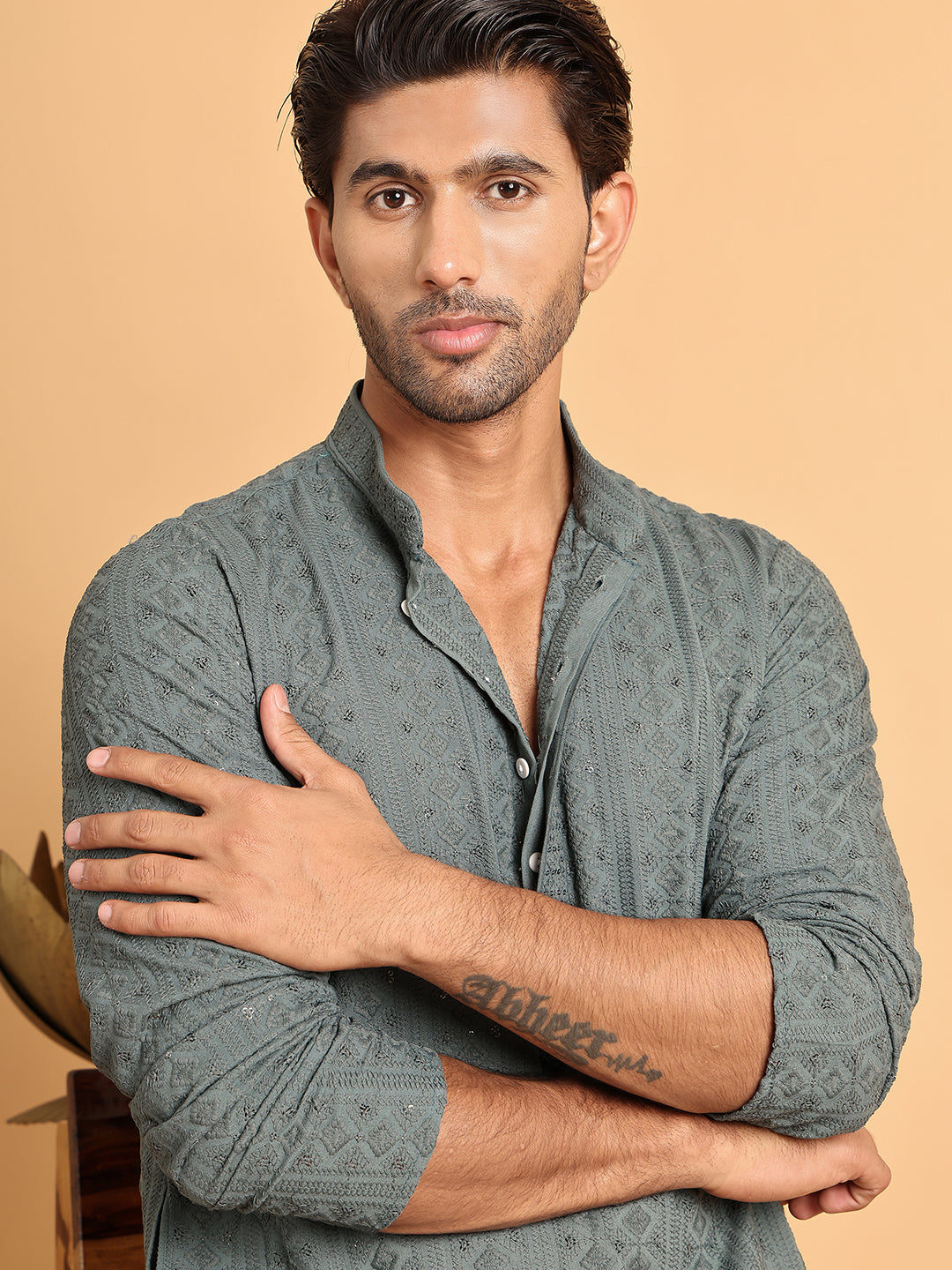 Embroidered & Sequins Straight Kurta Set For Men ( JOKP P 5116Grey )