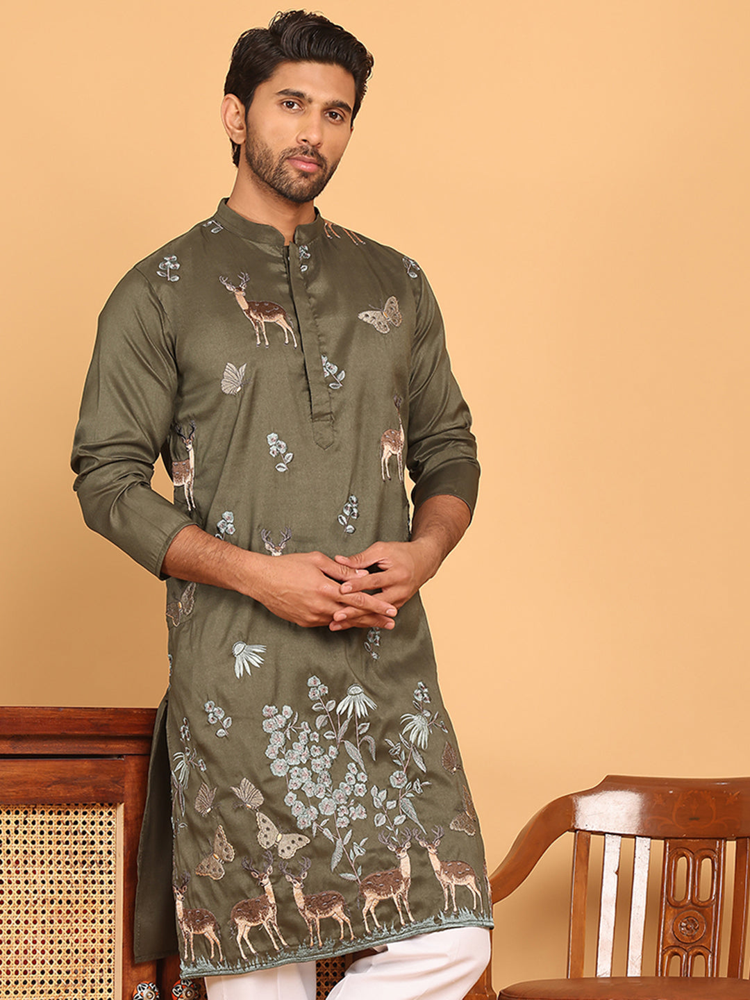 Embroidered Straight Kurtas For Men ( KO 5171 Olive )