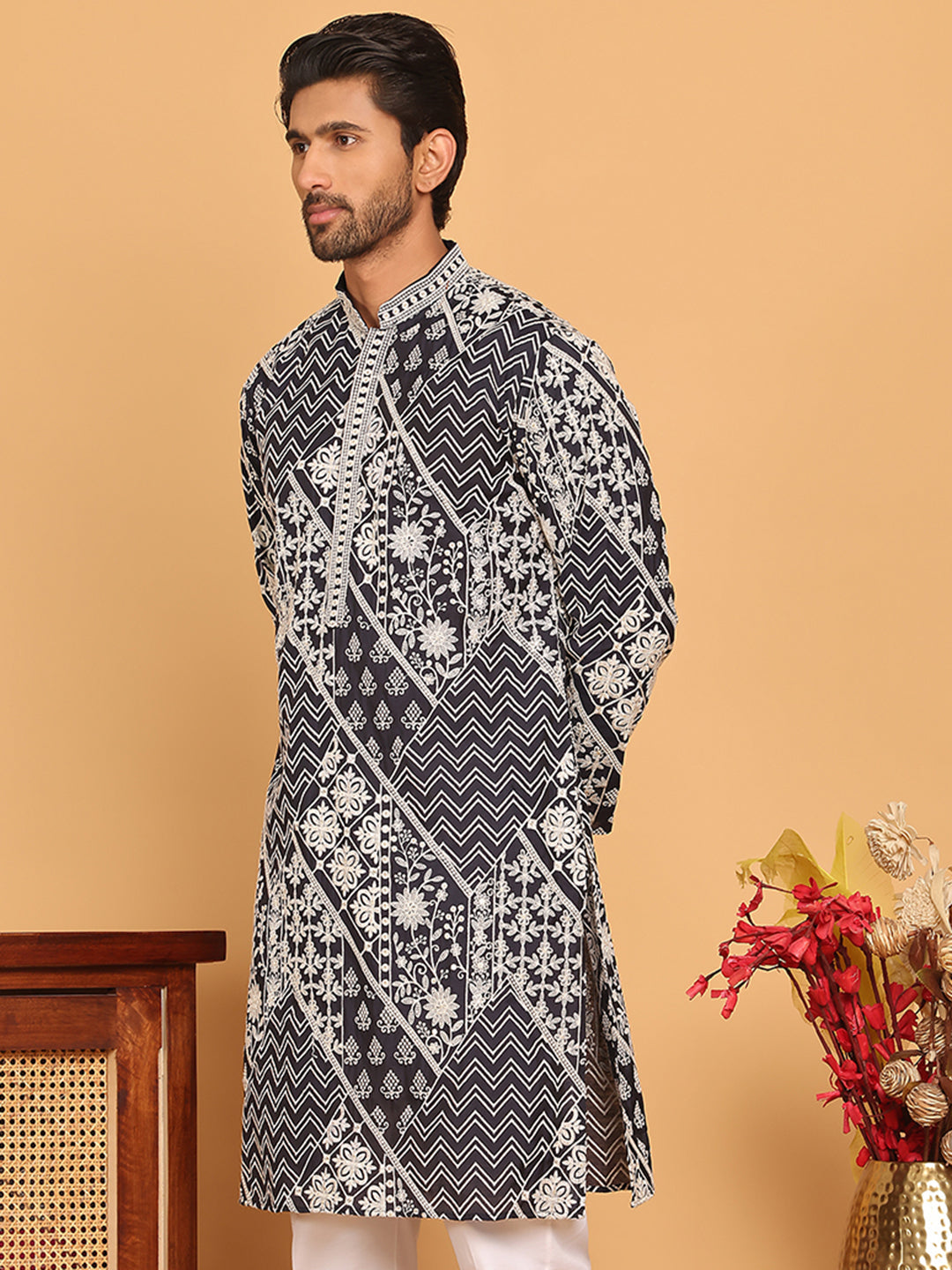 Floral Embroidery Silk Blend Kurtas for Men ( KO 5182 Navy )