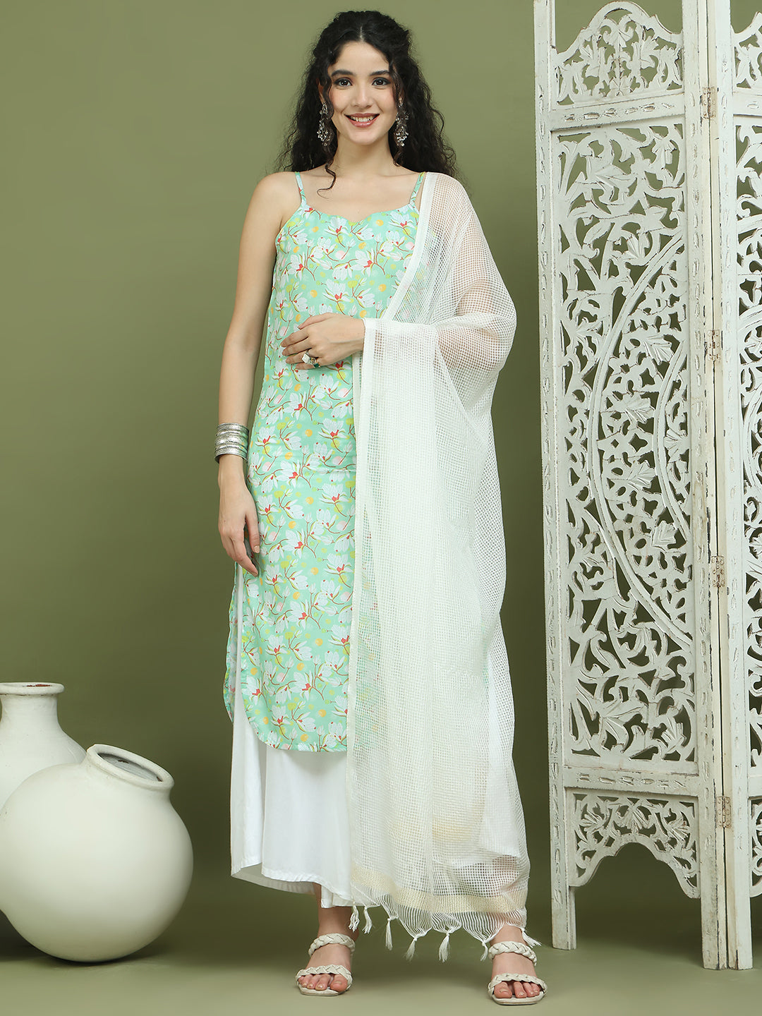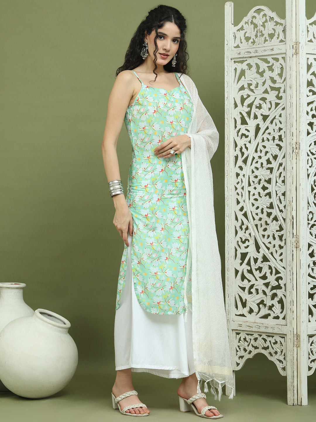 Floral Printed Rayon Kurta Palazzos with Dupatta ( JOKPL 2137W D31W 1578 Green )