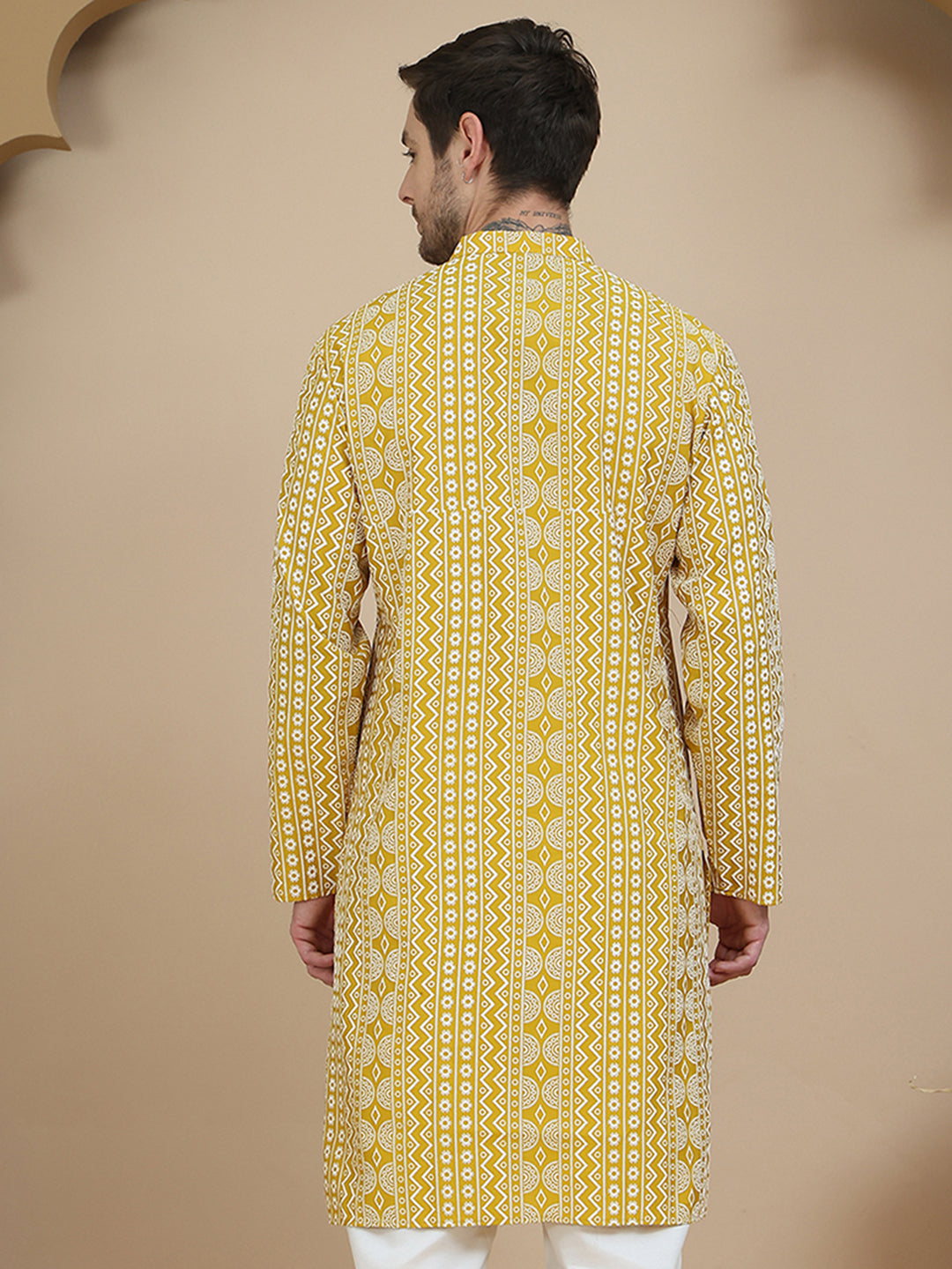 Geometric Print Silk Blend Straight Kurtas for Men ( KO 5250 Yellow )