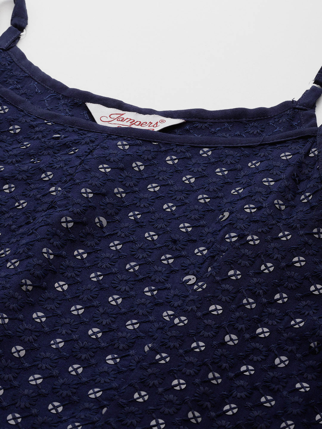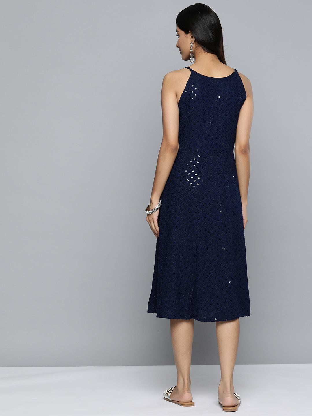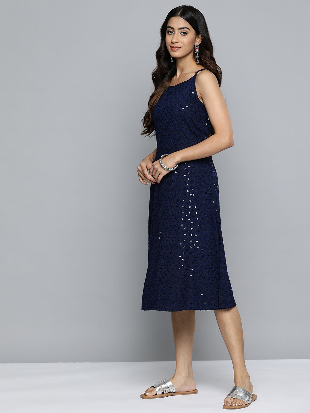 Jompers Navy Floral Sequin Embroidered A-Line Midi Dress ( JOK 1494 Navy )