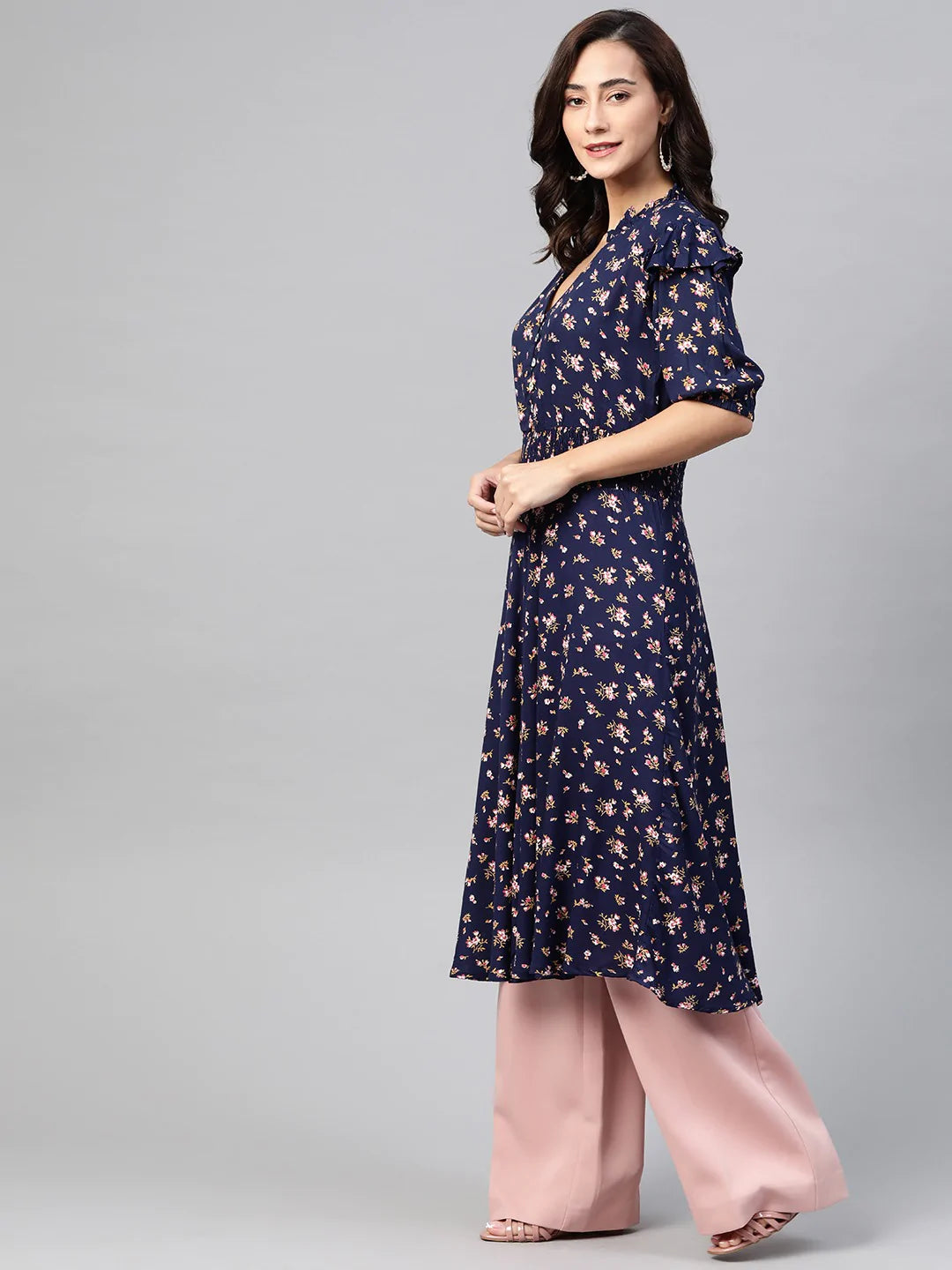 Jompers Women Navy Blue & Pink Floral Printed Floral Anarkali Kurta ( JOK 1386 Blue )