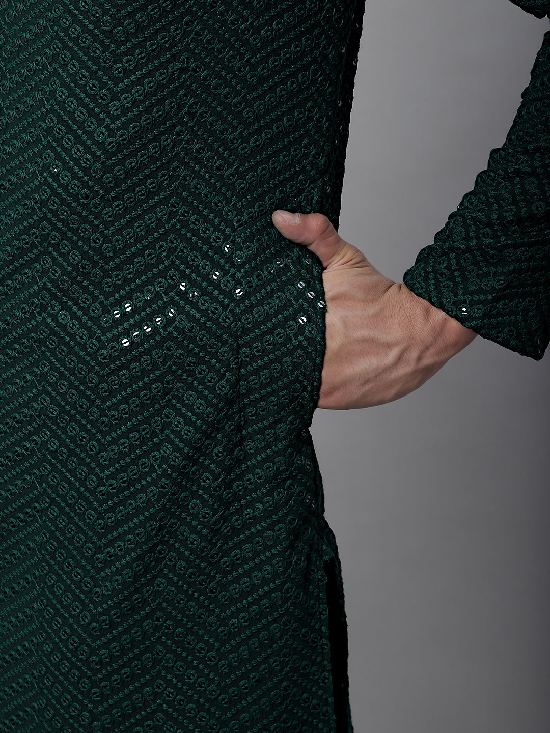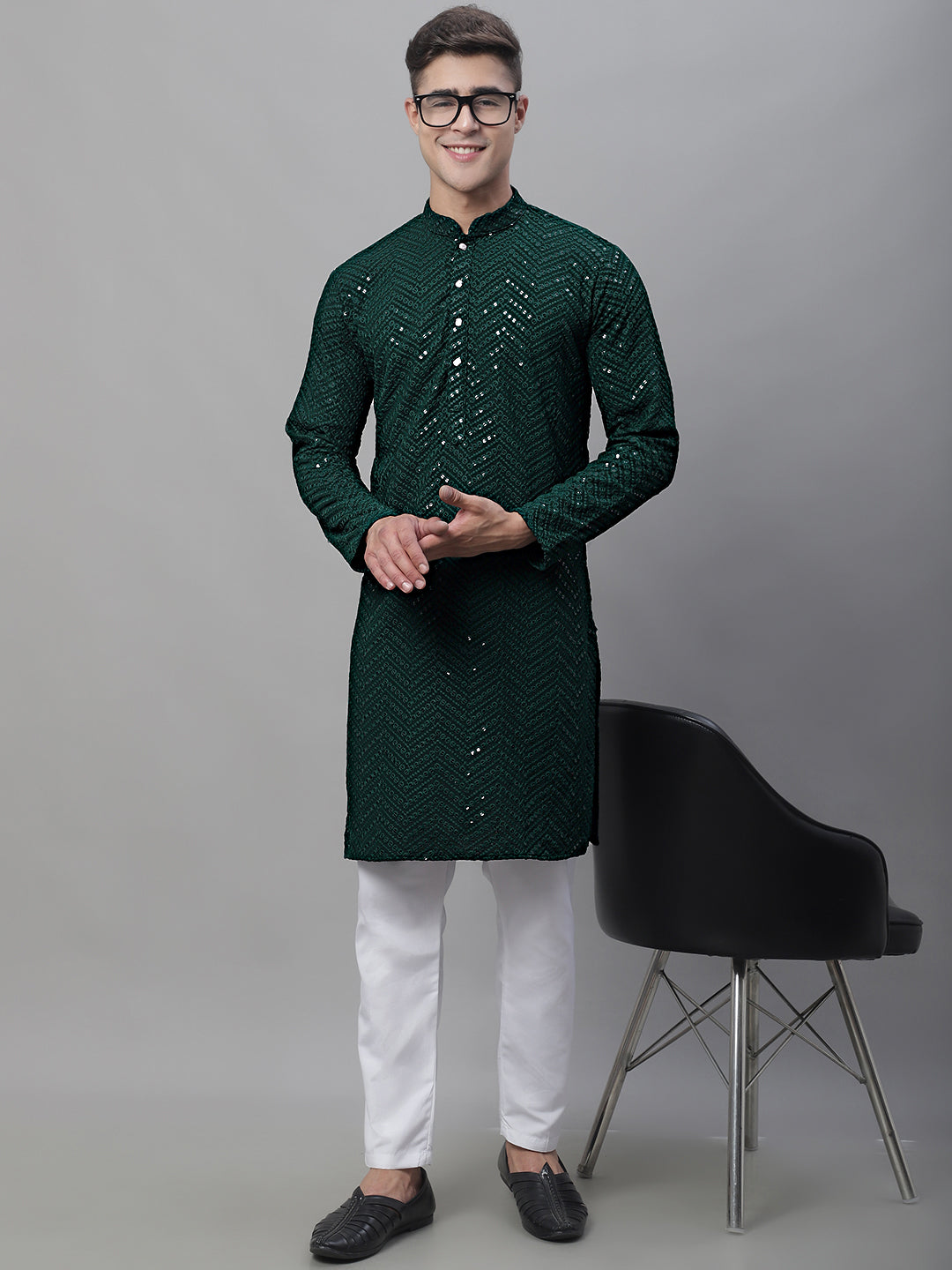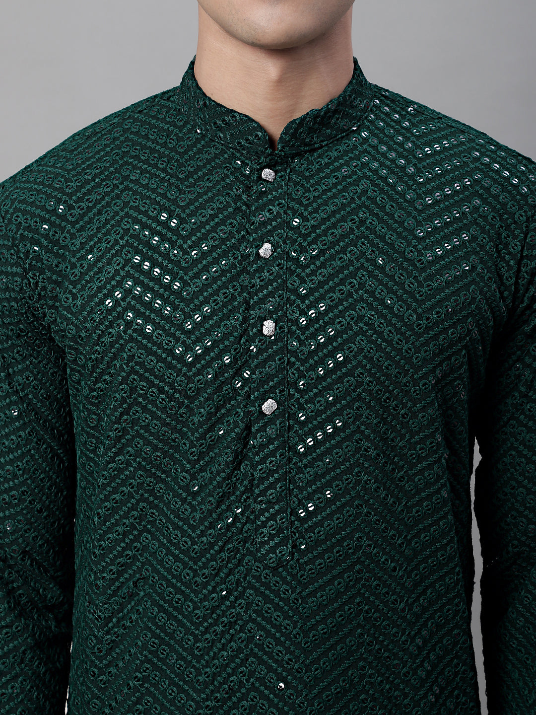 Men Olive Green Embroidered Sequinned Kurtas