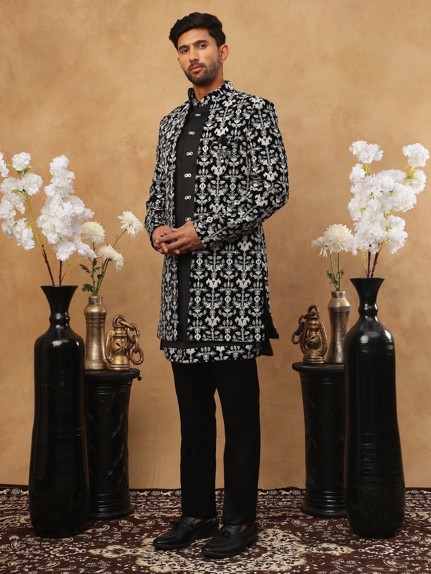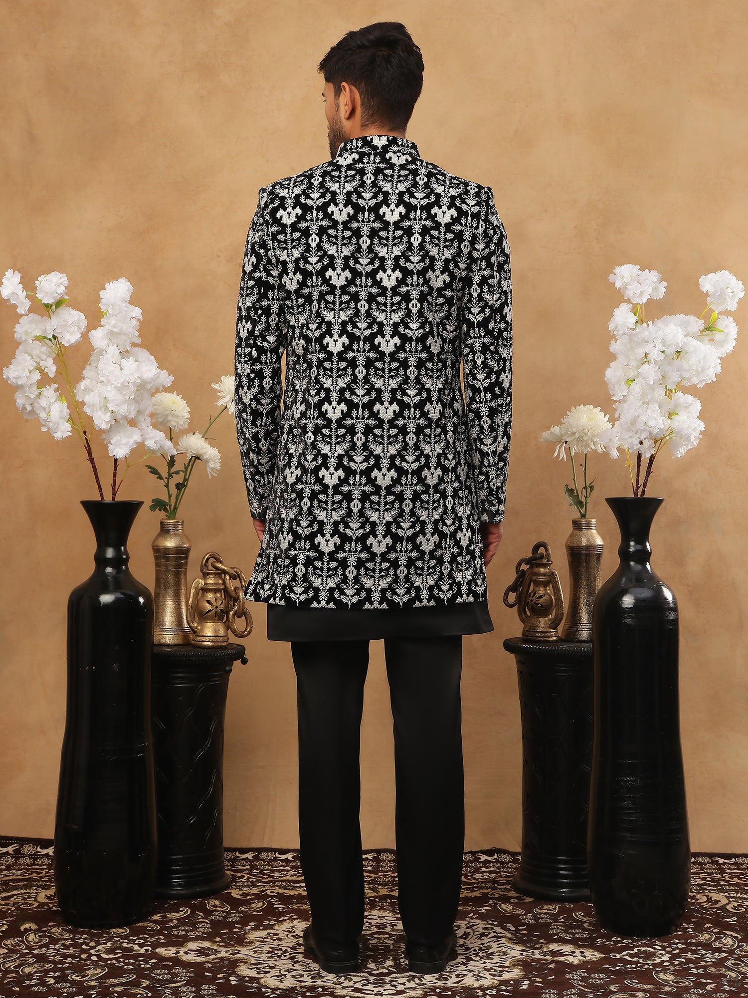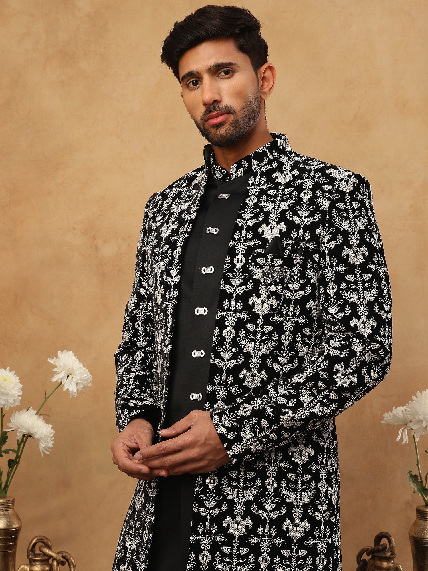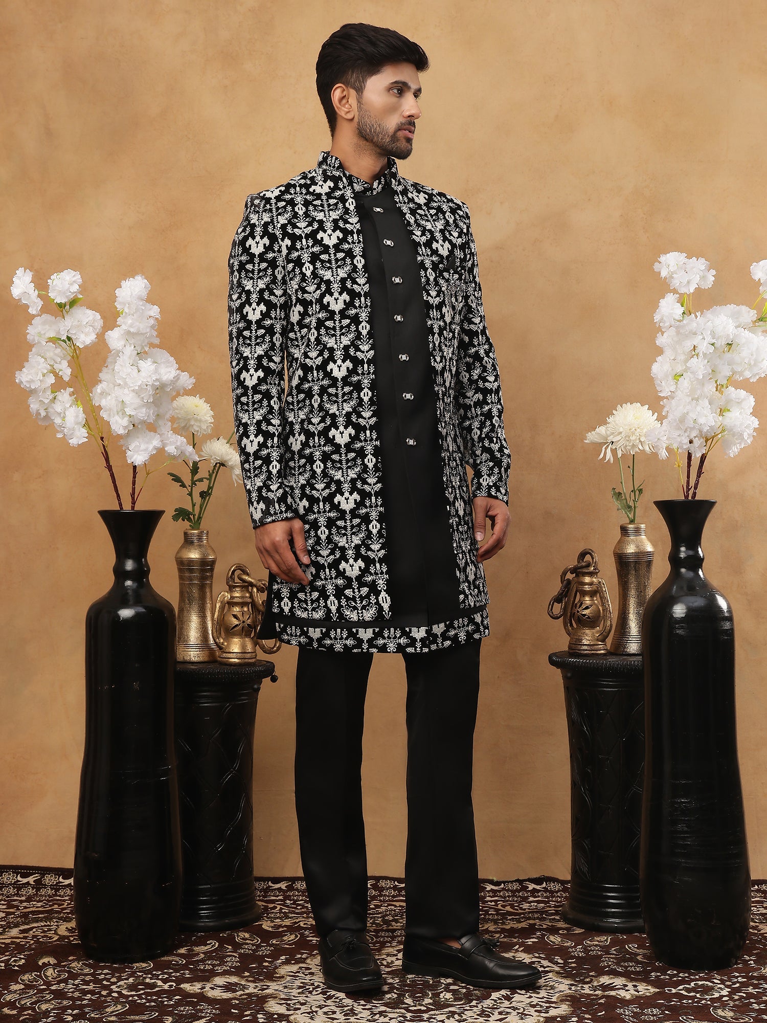 Step into the spotlight with this masterpiece of modern ethnic fashion. This Black & Off-White Indo-Western Sherwani is crafted from rare Imported Japanese Cotton-Silk, offering a texture and finish that stands apart from standard fabrics. The design is a bold study in contrast, featuring heavy off-white floral embroidery against a pitch-black canvas. It creates a look that is both traditional and sharply contemporary. Finished with unique rectangular crystal buttons and a tailored fit, this outfit is designed for the groom who wants to look distinctive, or a guest who intends to turn heads at a reception or gala.