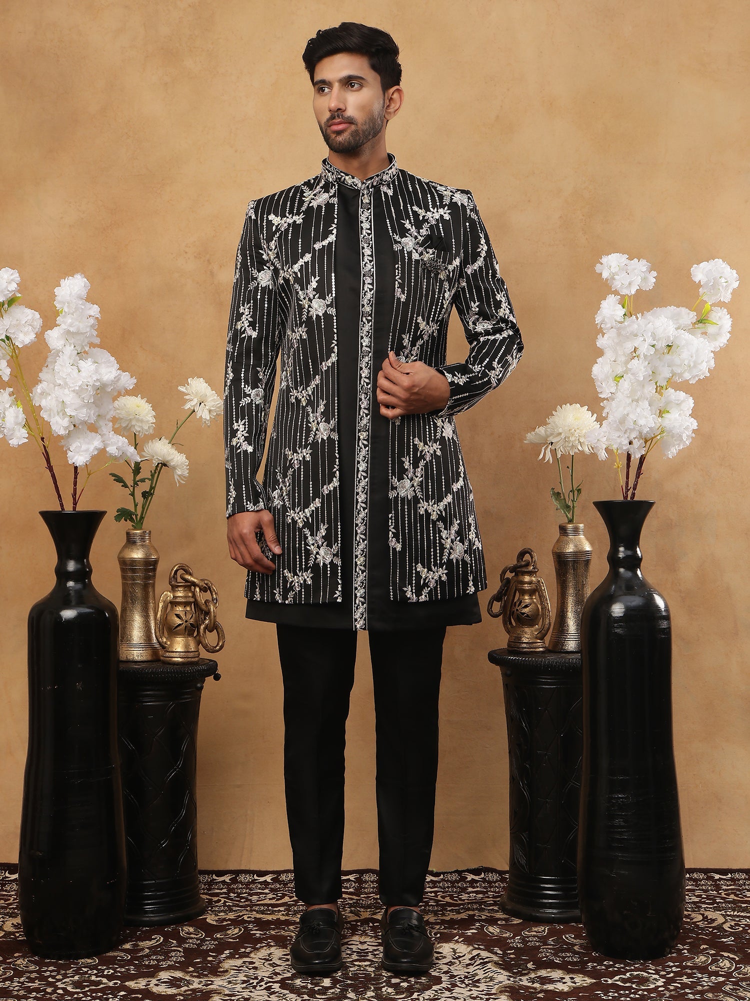 Unleash your inner fashion icon with this spectacular Black Indo-Western Sherwani. This isn't just a suit; it's a work of art crafted from rare Imported Japanese Cotton-Silk. Unlike heavy velvets, this fabric offers superior breathability and a crisp structure, making it perfect for dancing at a Sangeet or attending a crowded reception. The jacket features a mesmerizing black-on-black wavy sequin texture, while the hem and cuffs are detailed with exquisite multi-colored bird and floral embroidery. It strikes the perfect balance between modern shimmer and artistic tradition.