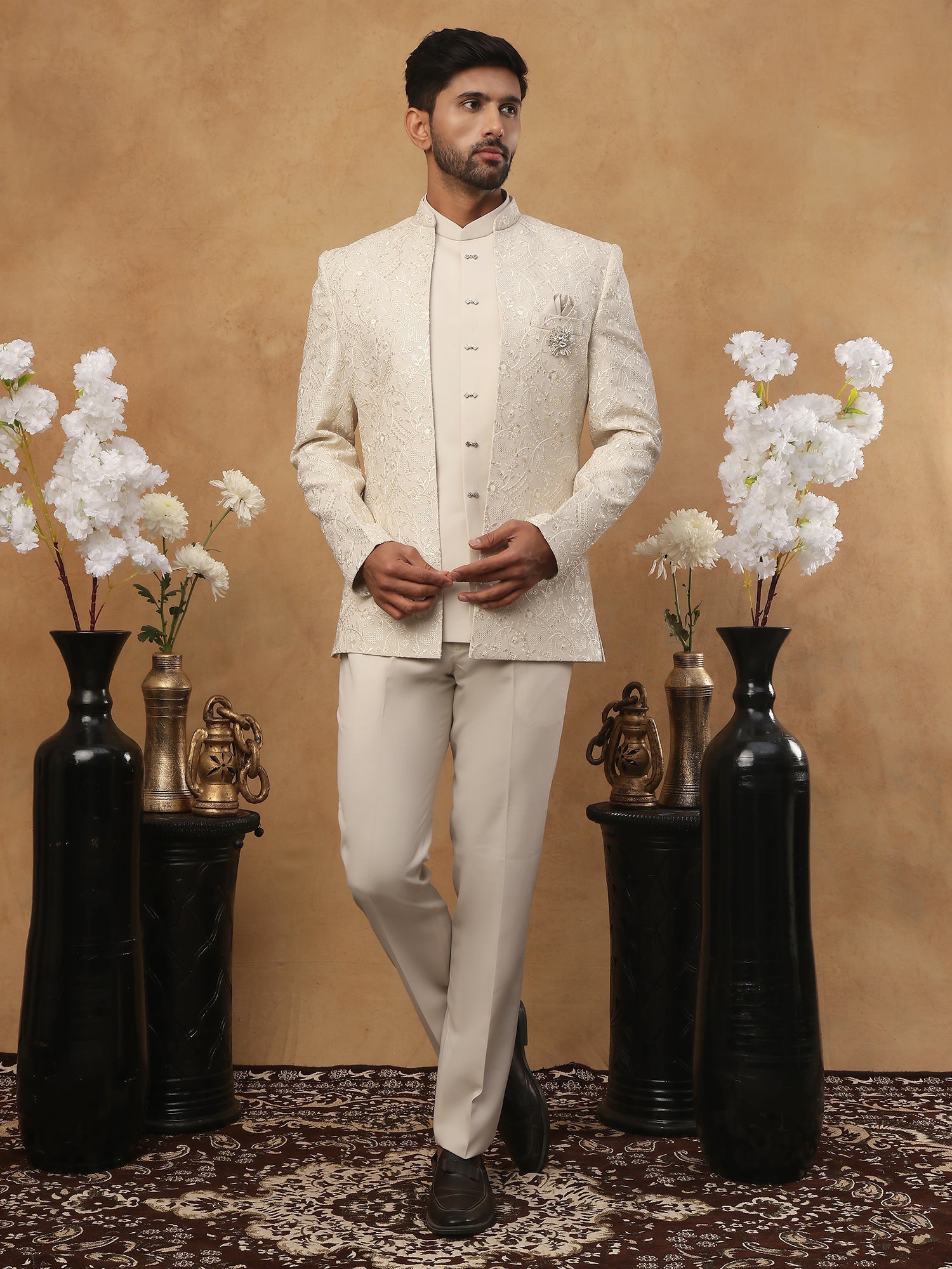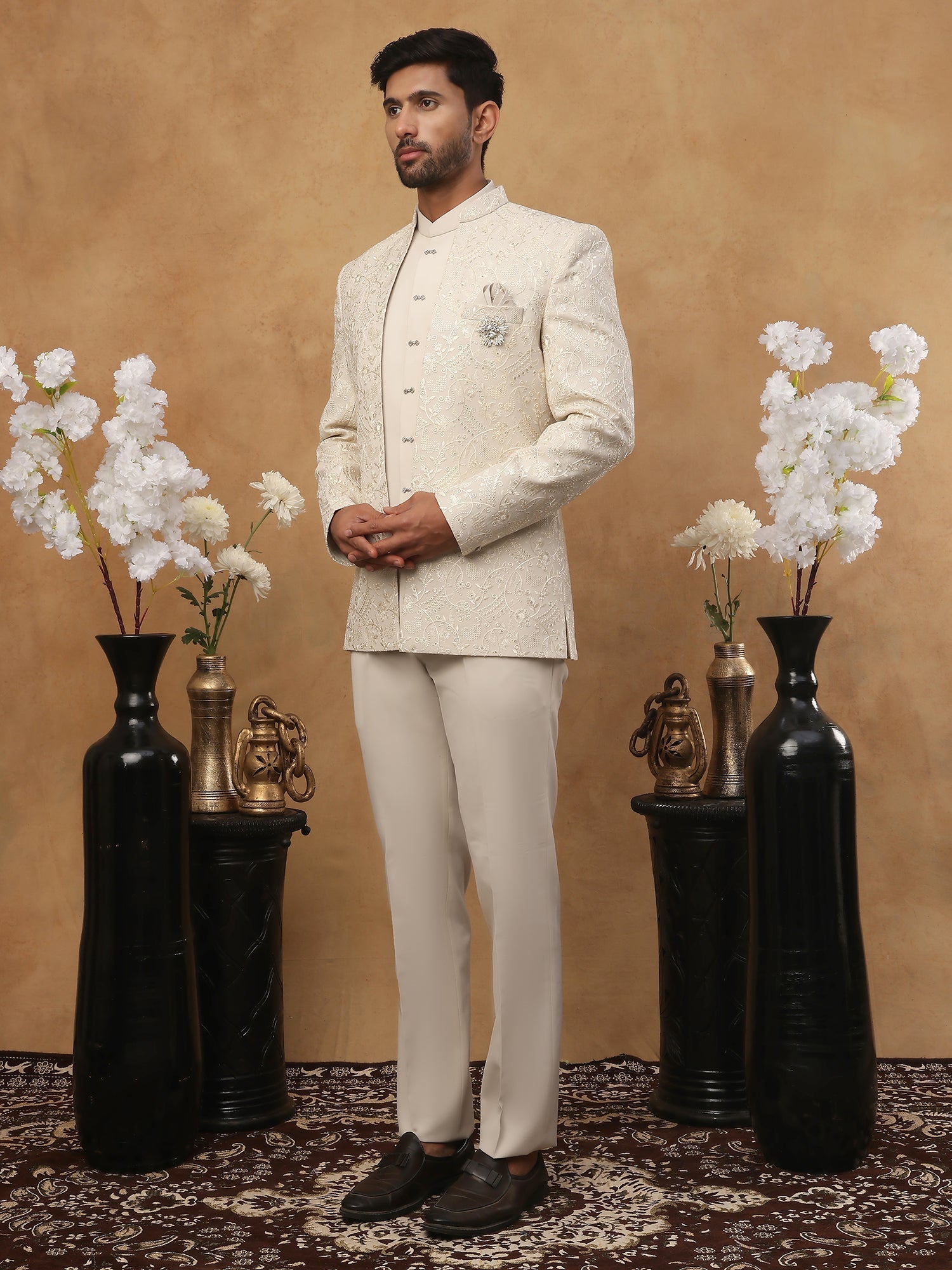 Men's Cream Tonal Floral Embroidered Indo-Western Set ( 50JIND 114 Cream )