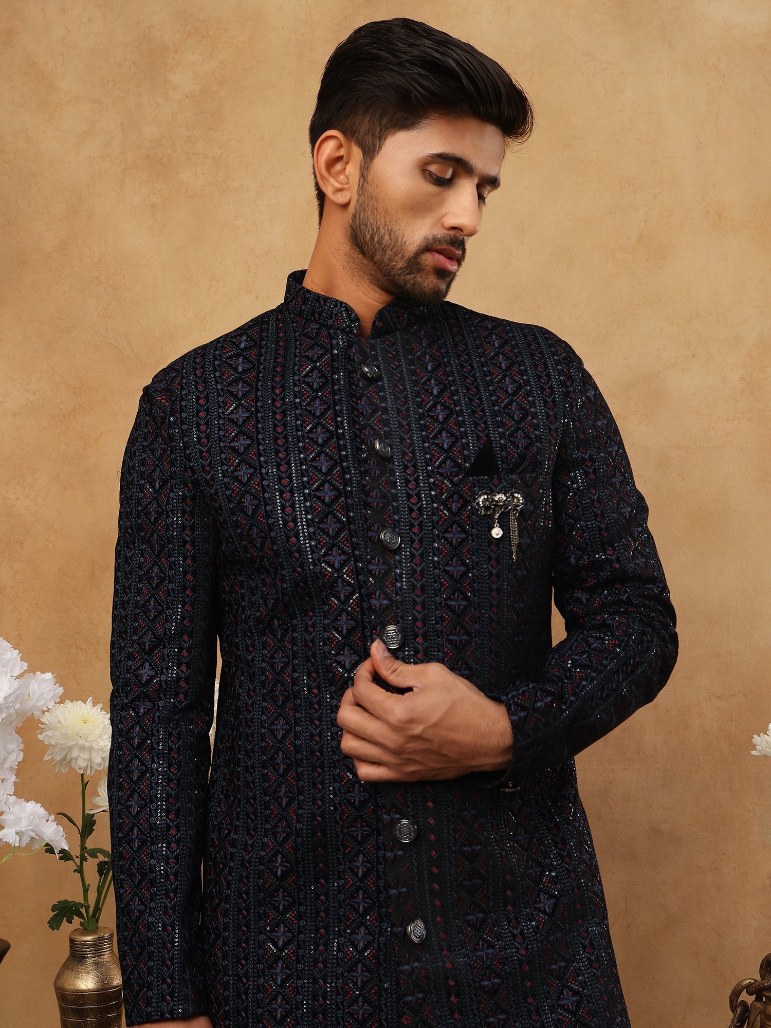 Men's Navy Blue Geometric Embroidered Indo Western Set ( 50JIND 103 Blue )