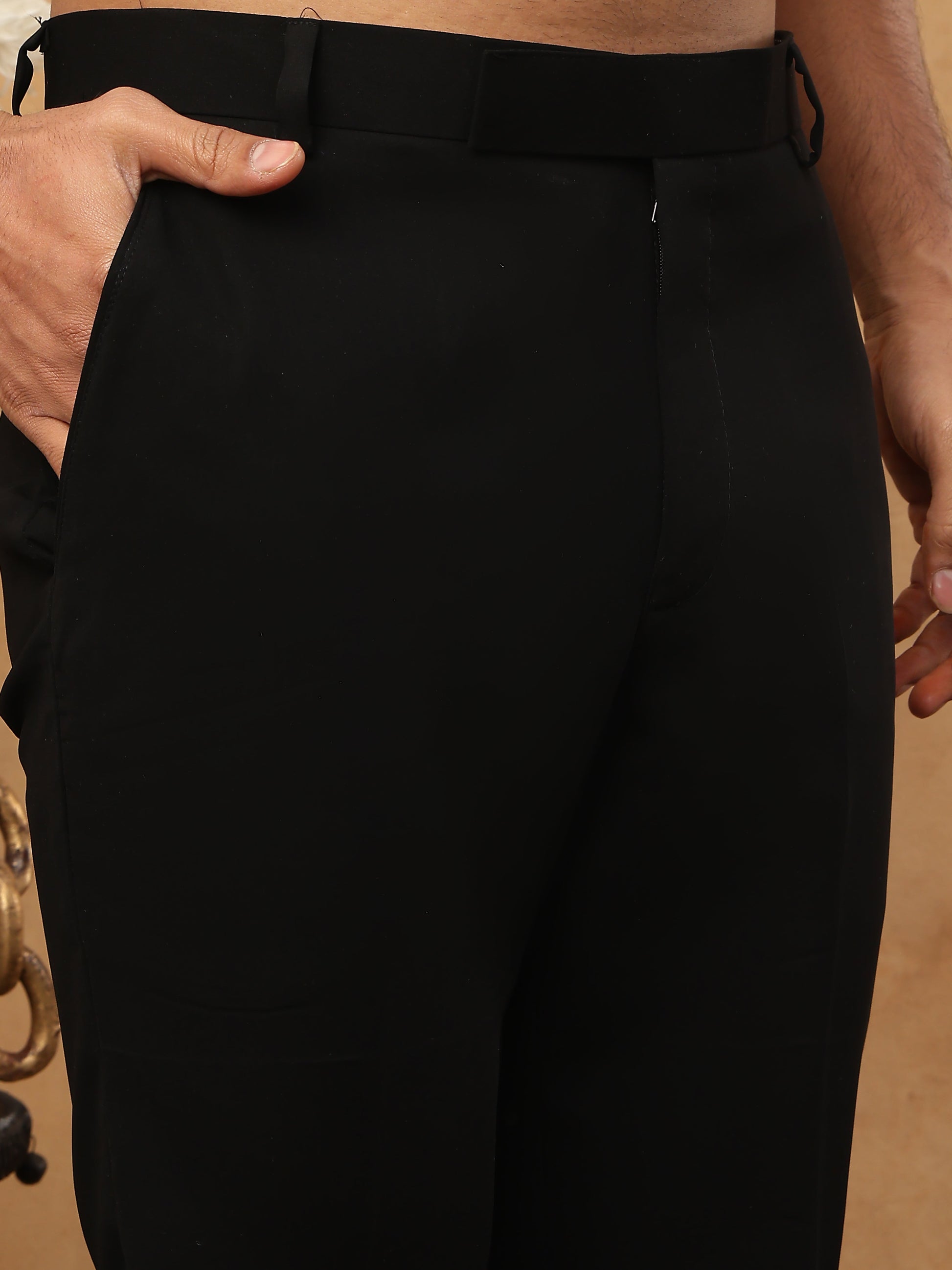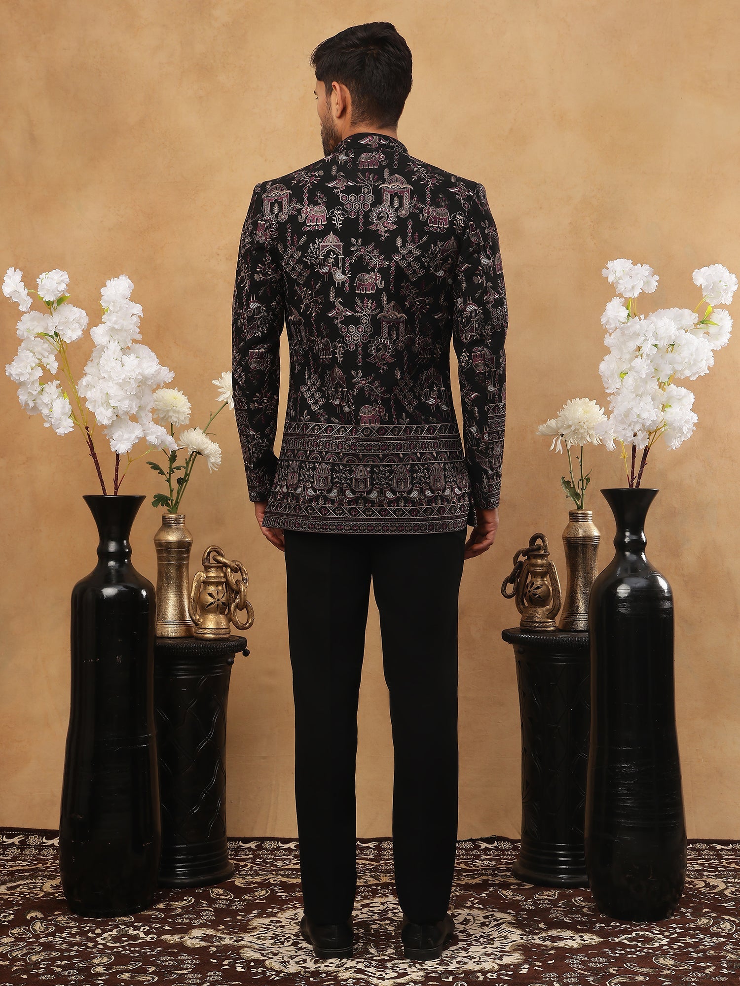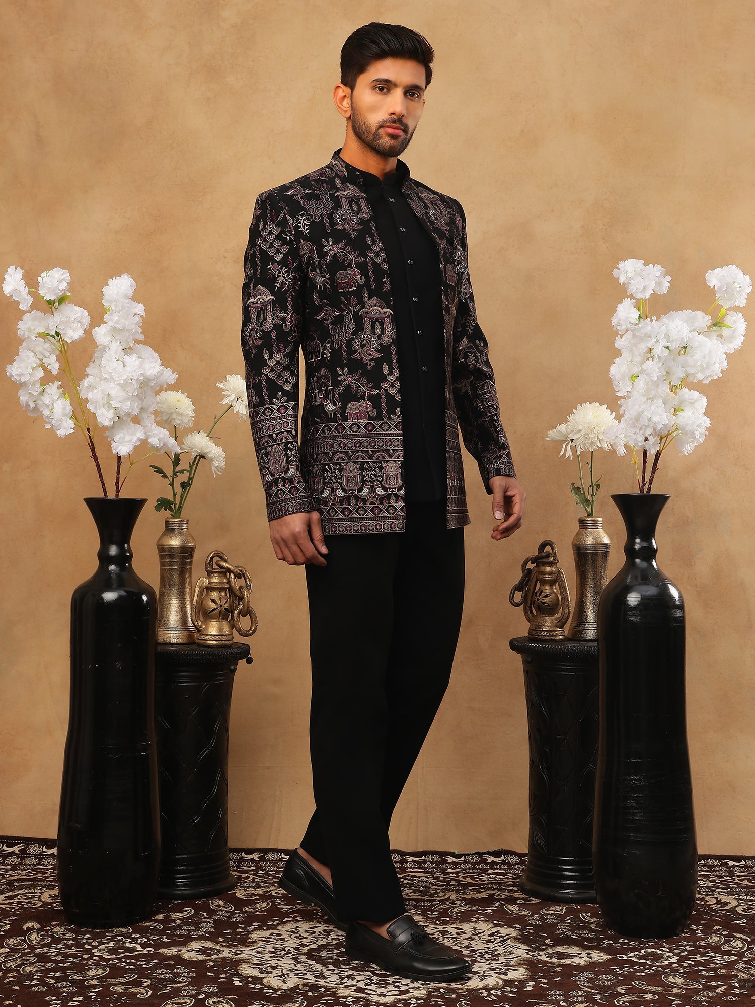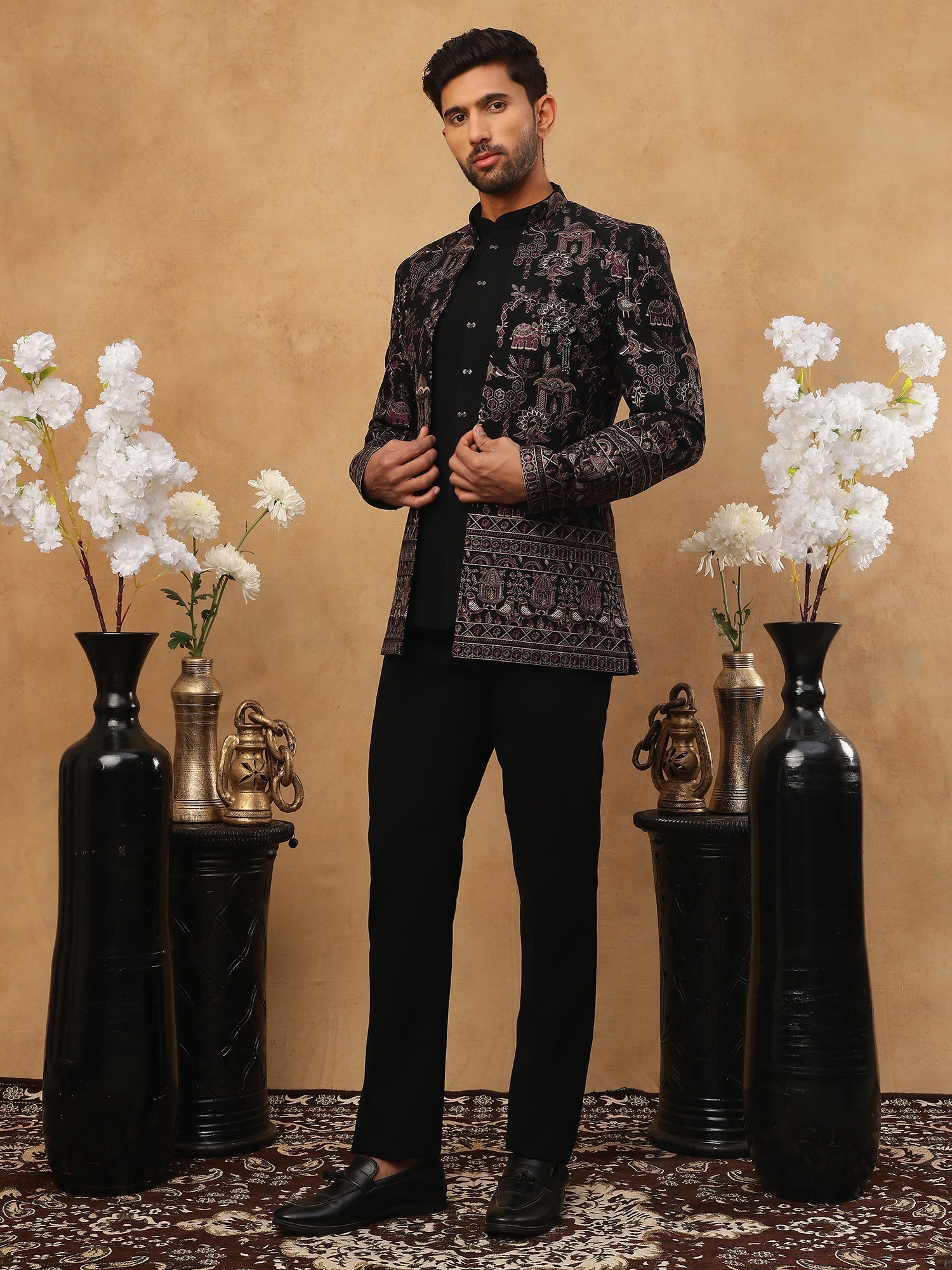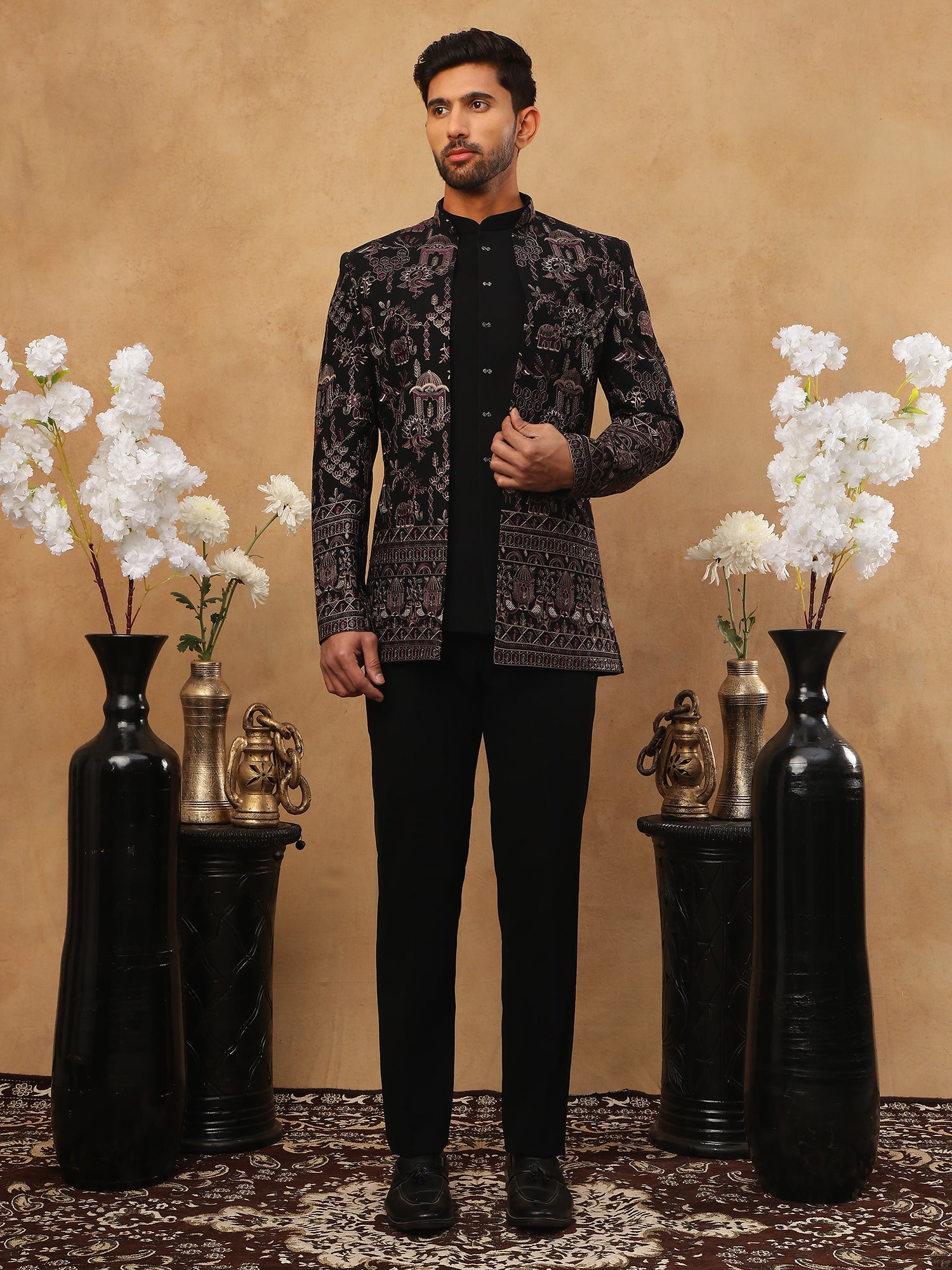 Wear a piece of art on your special day with this Heritage Black & Purple Indo-Western Sherwani. Crafted from exclusive Imported Japanese Cotton-Silk, this outfit tells a story of royalty. The fabric is adorned with intricate embroidery featuring majestic elephants, peacocks, and traditional palace architecture—motifs historically reserved for kings and royalty. The muted purple and mauve thread work against the jet-black background creates a look that is rich, cultural, and incredibly sophisticated. Perfect for the modern groom who wants to honor tradition while looking sharp and contemporary.