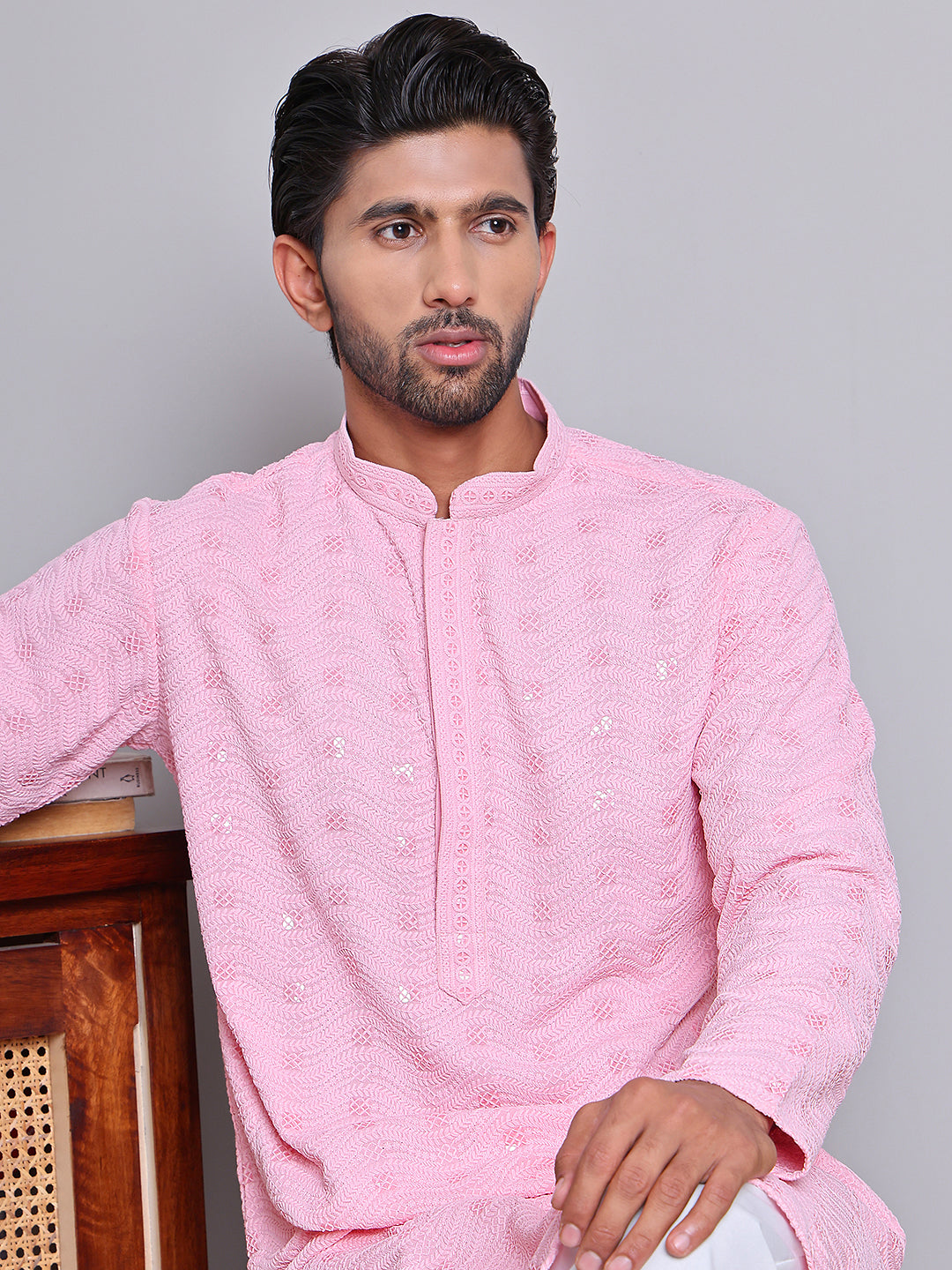 Men's Embroidered and Sequence Kurta Pyjama Sets ( JOKP 5145Pink )