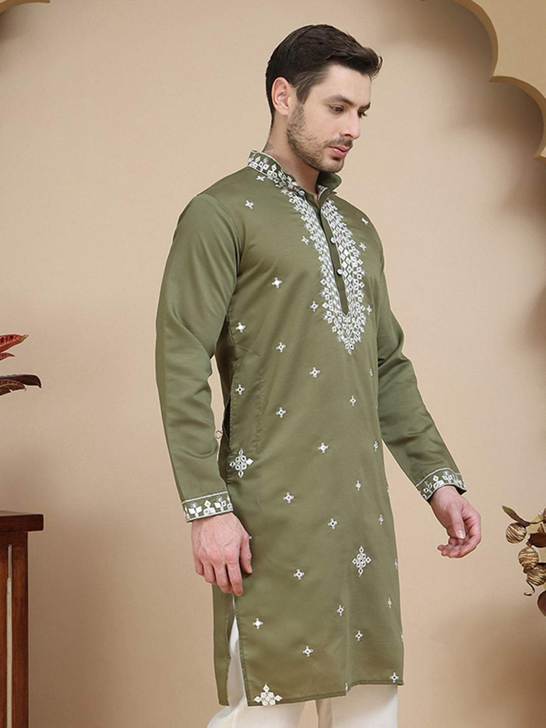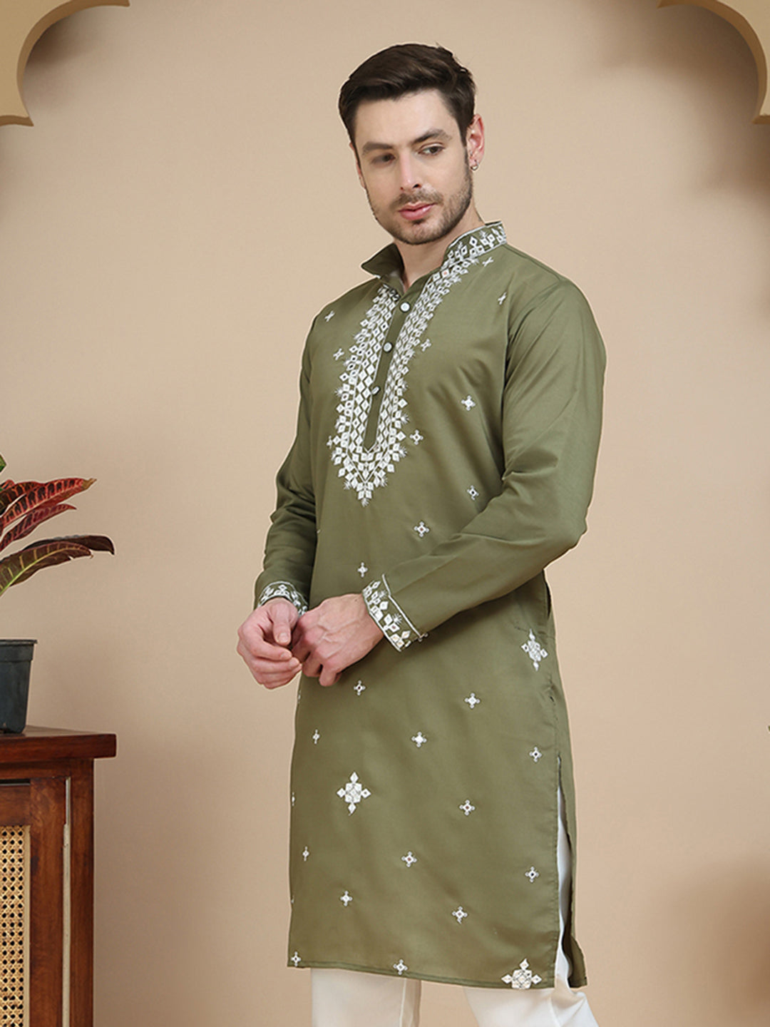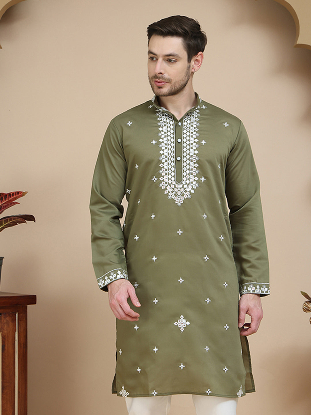 Men's Embroidered Kurtas ( KO 5045 Olive )