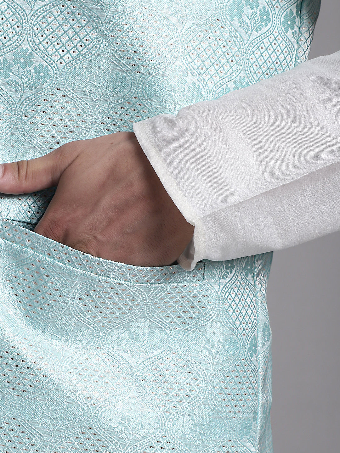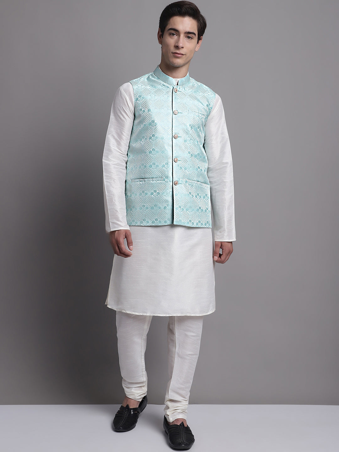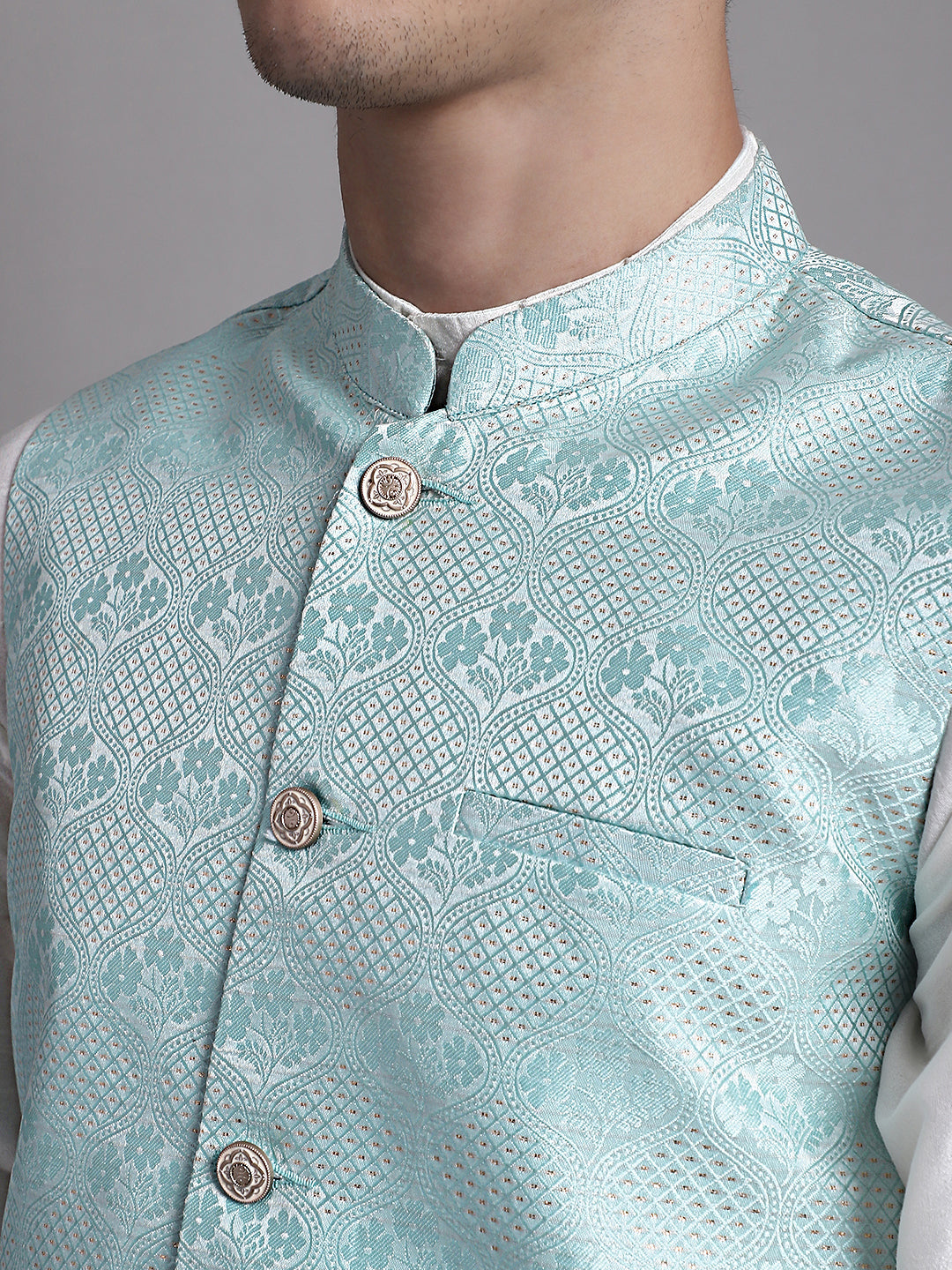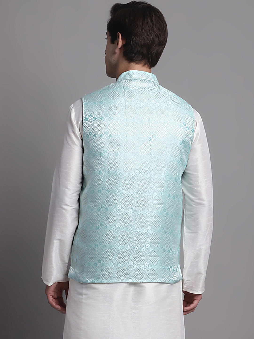 Men's Turquoise Blue Woven Design Nehru Jacket
