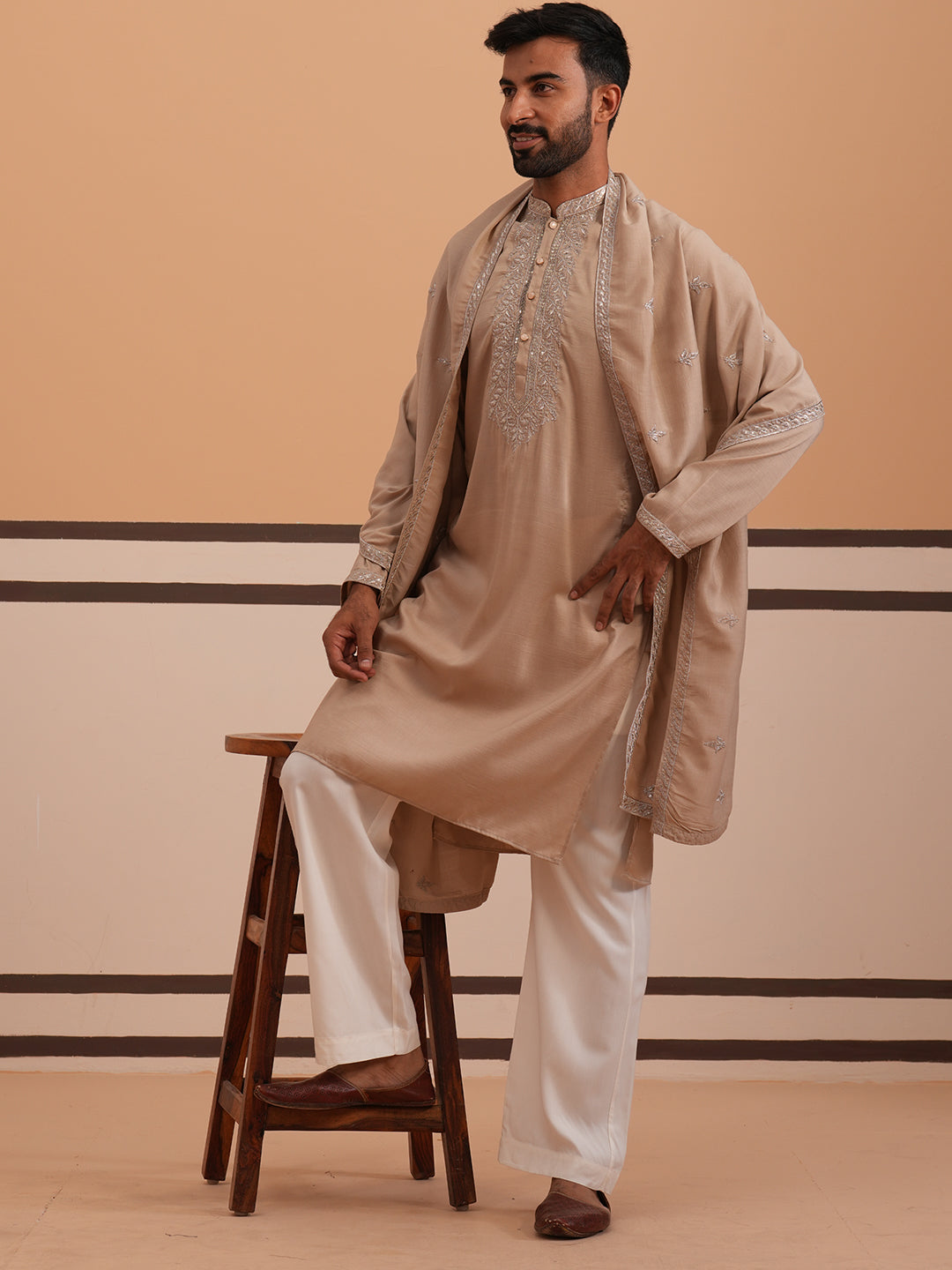 Silk Blend Kurta Set with Matching Embroidered Dupatta (65KP D-PJ11W 5375 Beige )