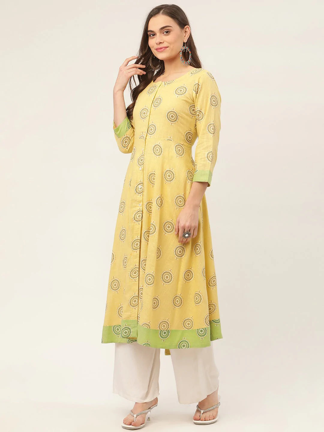 Women Pista Green Cotton Blend Flared Printed kurta ( JOK 1425 Pista )